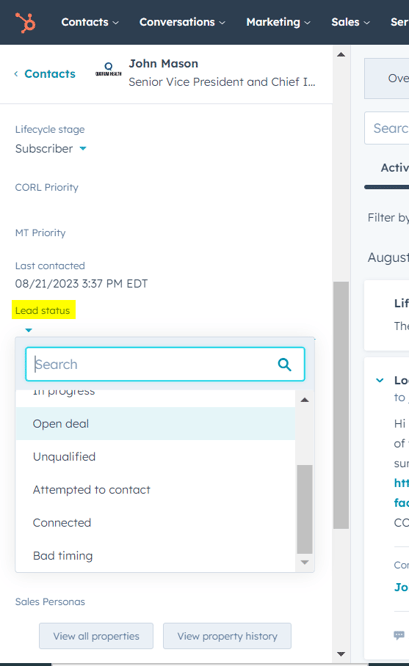 Click into the contact whose status you are updating. On the left-hand side inside the contact page, scroll down until you see "Lead status". Update the value there.