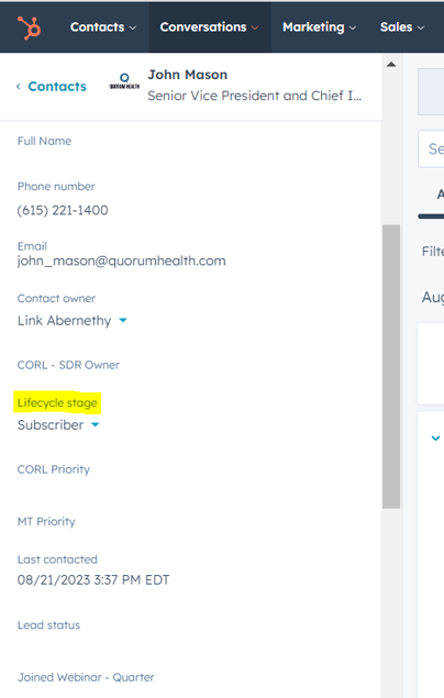 Click into the contact whose status you are updating. On the left-hand side inside the contact page, scroll down until you see "Lifecycle Stage". Update the value there.