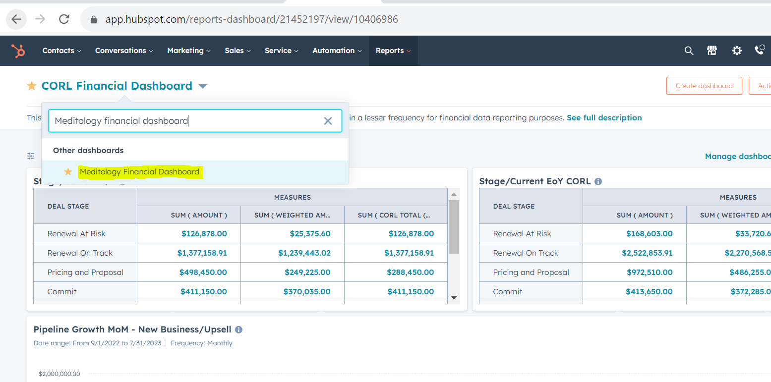 Navigate to the "Meditology Financial Dashboard". To do this, log into HubSpot, navigate to the Reports tab at the top of the screen, click it and select Dashboards. If you do not have access to HubSpot, or the Reports tab is not showing, please reach out to your HubSpot Administrator for access and permissions.