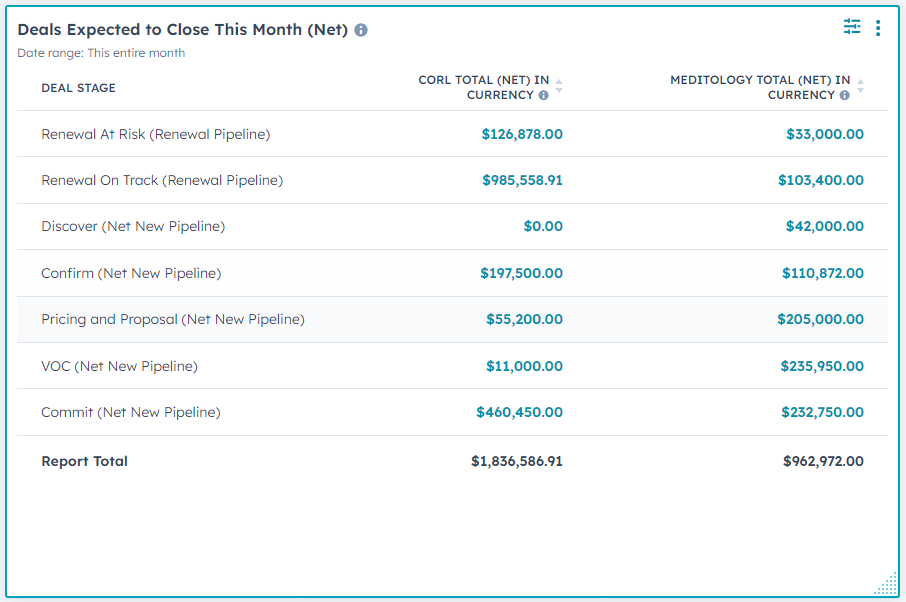 Important note: these are deals expected to closed for both Meditology and CORL. For information on how to filter on by business unit visit the article "How can I filter by business unit in HubSpot?" in this Knowledge Base.