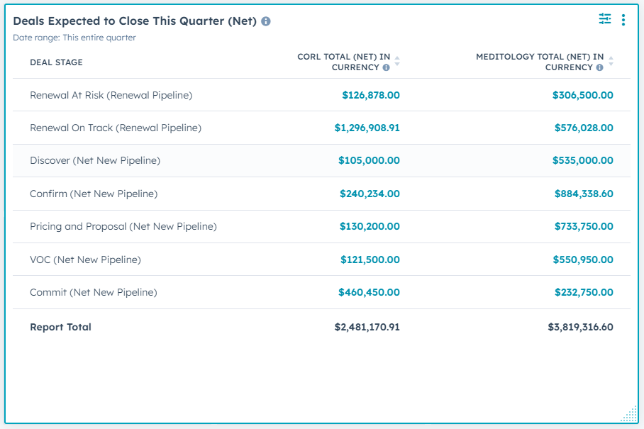 Important note: these are deals expected to closed for both Meditology and CORL. For information on how to filter on by business unit visit the article "How can I filter by business unit in HubSpot?" in this Knowledge Base.