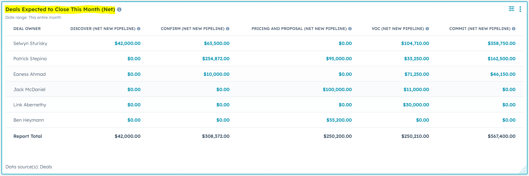 Scroll down until you find the report "Deals expected to close this month (Net)". Locate you name and you will find your deals expected to close this month in each stage.