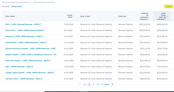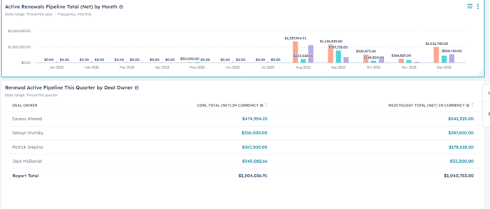 You can also view active renewals by month and by owner. The reports below contain Meditology, CORL, and renewals that have both business units, but you can see the CORL renewals are purple. To view the deals inside each bar in the "Active Renewals Pipeline Total (Net) by Month" report, click the respective bar and a detailed list of each deal will populate. You can export those numbers by hitting "Export" in the top right corner after clicking into the bar.