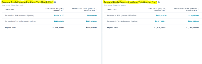Other useful reports for open renewals in the 2023 Renewals Dashboard are "Renewal Deals Expected to Close this Month (Net)", and "Renewal Deals Expected to Close the Quarter (Net)".