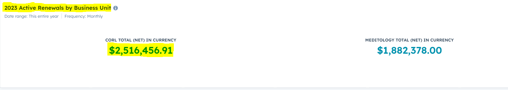 In this dashboard, you can view open renewals by business unit by navigating to the report "2023 Active Renewals by Business Unit". Click on the number, $2,516,456.91, CORL Total (Net) In Currency, and a detailed list of closed won bookings for CORL will appear. Please note: these are example numbers. You must go to the dashboard for the updated information.