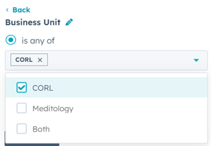 Hit "And", then type into the search bar "Business Unit". Select the one highlighted below, and then in the dropdown, select CORL and hit apply.
