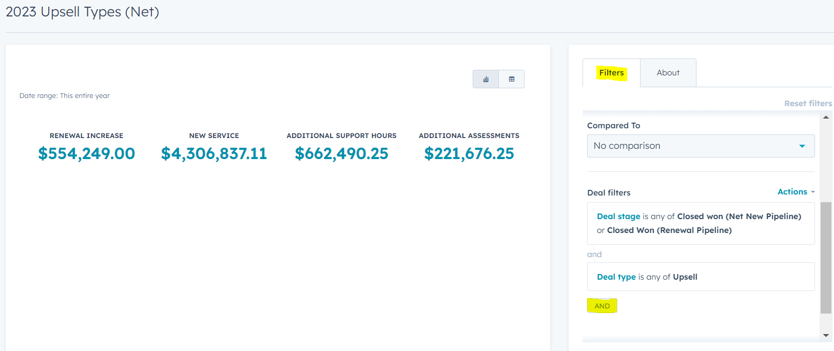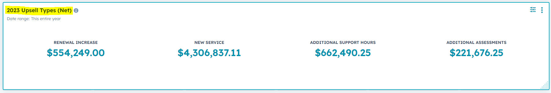This looks at all renewal deals that have a renewal upsell in HubSpot, also known as a renewal increase. Important: A deal can be an upsell without having a renewal, so it is crucial to look specifically at renewal increase deals.