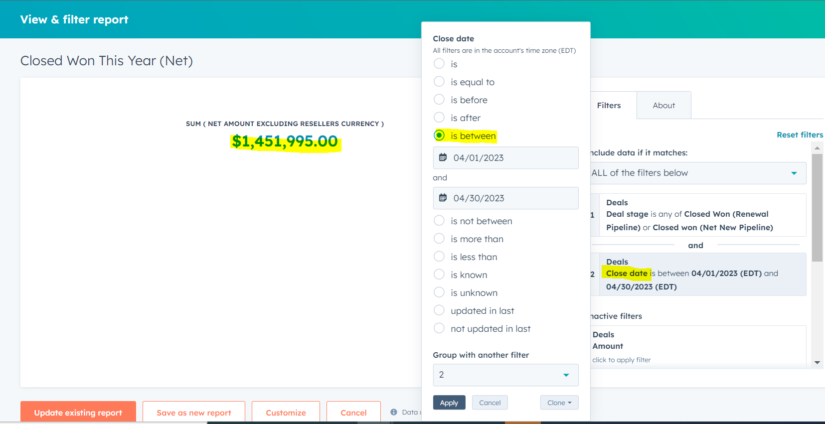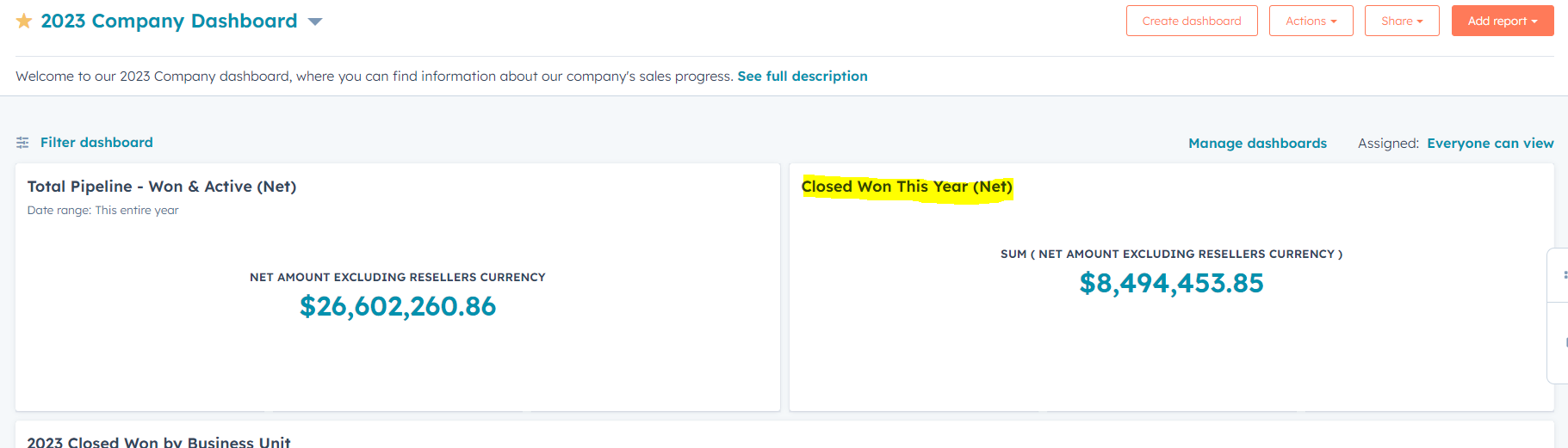Navigate to the 2023 Company Dashboard here, or by going to Reports -> Dashboards -> 2023 Company Dashboard. Find the report named "Closed Won this year (Net)."