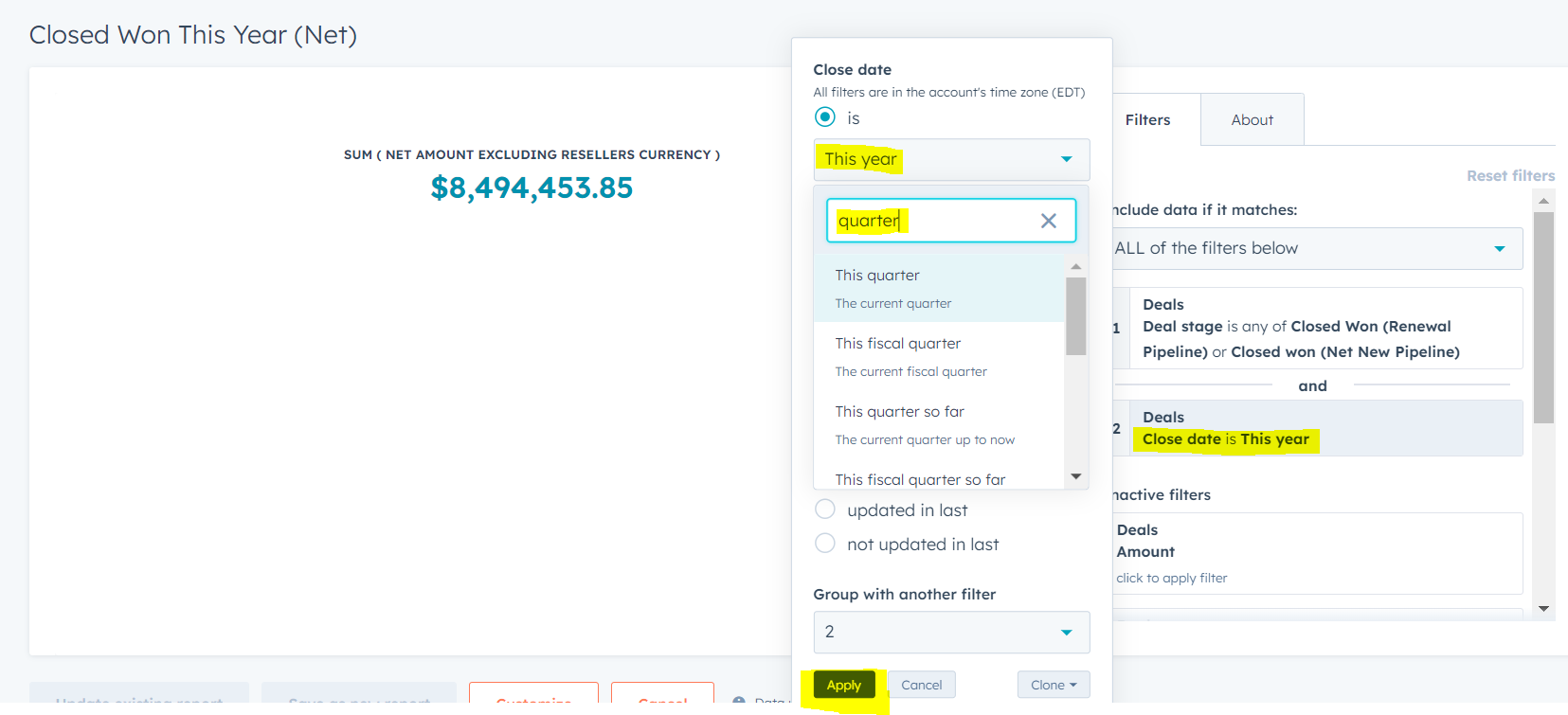 Hover over the report and click the 3 lines in the top right. Inside the report will be a filter that says close date. Filter the date for the needed quarter, select it, and hit apply.