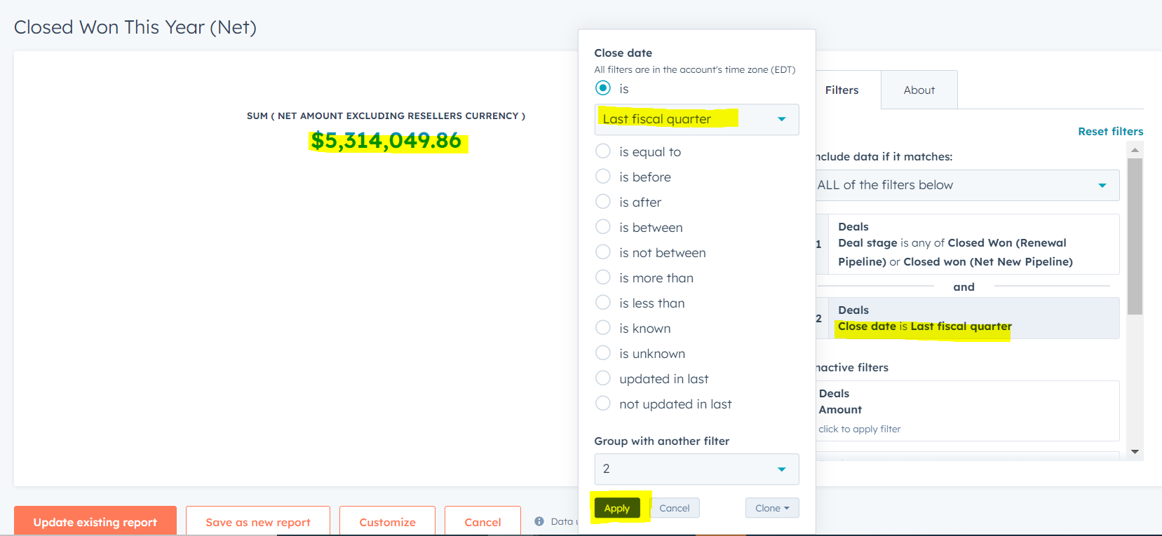 Hover over the report and click the 3 lines. Located the filter "Close Date" on the right hand side of the report and click it. Select the "in between" filtering option and set the date parameters you need. Click Apply.