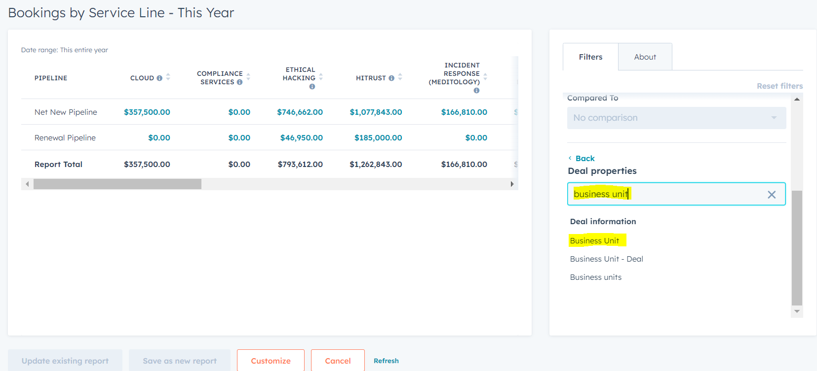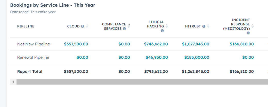 Step 2: Navigate to the report titled "Booking by Service Line - This Year." This report is a detailed breakdown of closed won pipeline by service line this year.