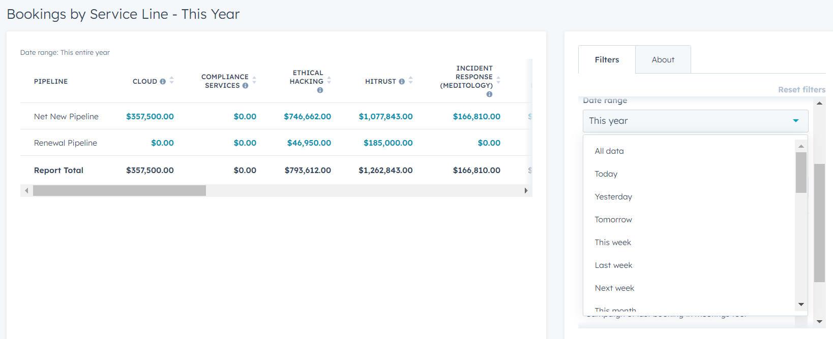 Find the section in filters for close date inside the "Booking by Service Line - This Year" report. Filter for the quarter, month, or custom date range needed. Hit Apply.