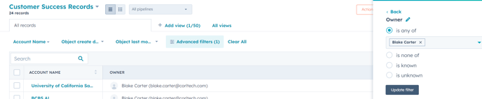 Next, navigate to the tab that says "Advanced Filters" and click "Add Filter". Select "Owner" and select your name. Then hit "Apply". This will show you a filtered view of only your accounts.
