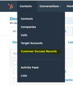 Your customer success records in HubSpot will be the primary source of information regarding your clients. In these records, you will track meetings, calls, notes on the client as well as monitor client health and happiness. To view these records, navigate to the top left where it says contacts and click the drop down option for Customer Success Record.