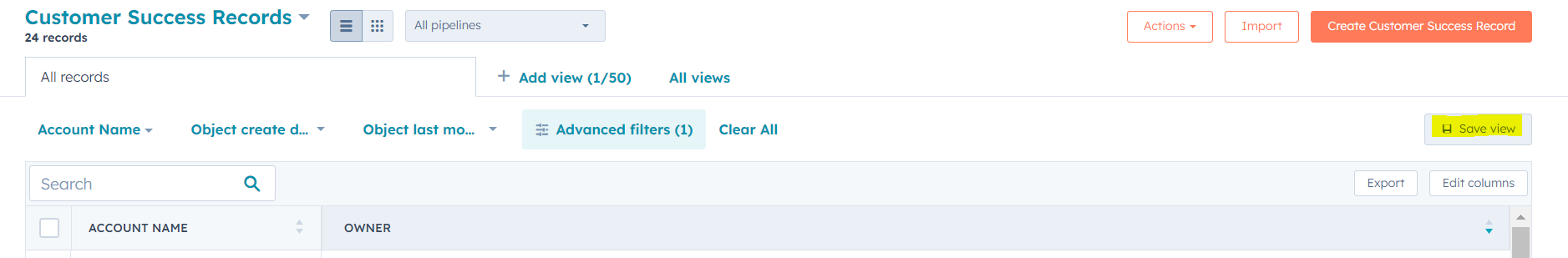 In order to save this view, exit out of the filters and find the "Save View" button towards the right side of the screen. Hit "Save as new" and name it.